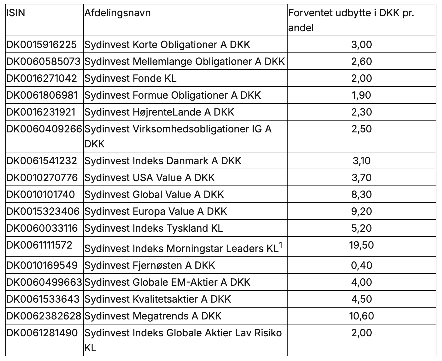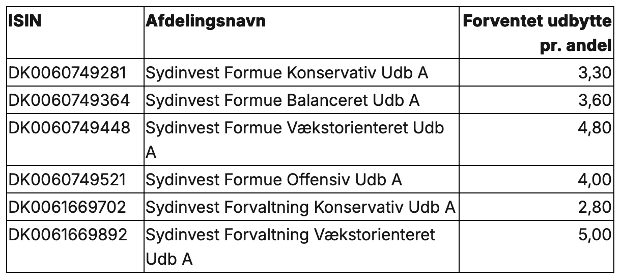 De forventede udbytter i Investeringsforeningen Sydinvest er foreløbige og kan ændre sig indtil den endelige årsrapport foreligger. Udbytterne skal godkendes på foreningens generalforsamling den 24. marts 2026, før de er endelige.Udbytterne forventes udbetalt i begyndelsen af februar 2026.