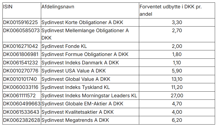 Vi forventer, at udbyttet går ind på investorernes konti den 6. februar 2025. Den sidste handelsdag for andele inkl. de foreløbige udbytter er den 3. februar 2025. Første handelsdag, hvor de foreløbige udbytter er fragået i kursen på andelene, er den 4. februar 2025. Der vil blive tilbageholdt udbytteskat i samtlige aktiebaserede afdelinger.